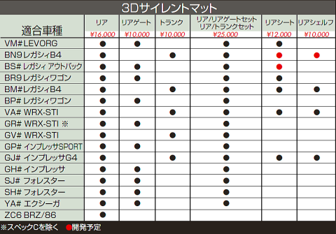 | 現行のスバル車に手軽に使っていただける防音マットを新発売!! 商品のタイプは5種類です @ スペアタイヤ部分用 : リア A リアゲートパネル内部 : リアゲート B トランク部分 : トランク ※@+Aのセット商品もあります ※@+Bのセット商品もあります C リアシート座面下部 : リアシート D セダン車のスピーカーボード部 : リアシェルフ 適合は、リストを参照 ![]() 車種によって使用する部品構成は異なりますが、いずれもユーザー様がDIY取付も可能なレベルで装着が可能で、簡単に効果の体感を実現いたしました。 ※一部工具を必要とする作業を伴います @ マフラーの気になるこもり音が減少 A ロードノイズの低減 B お手軽に装着出来る と良い事だらけです(^_^)v 詳しくは説明をよくご覧下さい |