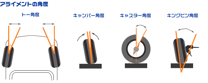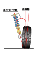 ホイール中心点を通る垂直線とキングピン軸との角度左右差が無いのが基本であり、差がある場合、角度が少ない方に車は流れようとします。
