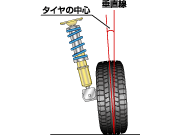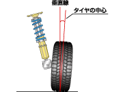 | キャンバーについて 接地面におけるタイヤの傾き。 タイヤの接地面の中心からの垂直線と、タイヤの中心線との角度がキャンバー角です。 タイヤの垂直線より、タイヤの中心線が内側にある場合はネガティブキャンバーと言い、逆に外側にある場合はポジティブキャンバーと言います。 |