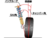 SAI角(キングピン傾斜角)車の前からロアボールジョイントとサスペンションサポート中心(ストラット式ではショックアブソーバーの中心、Wウィッシュボーン式ではアッパーリンクとサードリンクの取り付け点)線と、タイヤの接地面からの垂直線との角度をキングピン角=SAI角と言います。