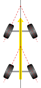 トーアウト車の進行方向に対してタイヤの先が外側に向く●ハンドリングに落ち着きがなく、外乱に影響され易くなる。 |