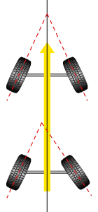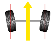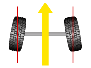 トーイン(一般的な基準方向)車の進行方向に対してタイヤの先が内側に向く●調整された適正トーインにより走行安定性とタイヤのロングライフが得られます 。 |