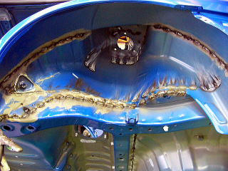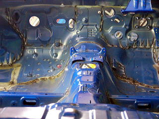 外れたトランク部より室内を覗いた図 普段最も目にすることがないアングルではないでしょうか? この後インパネ&配線も全て外します。 |