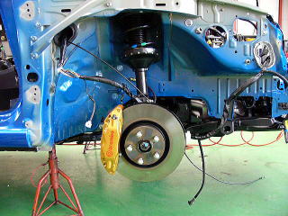 フロント足回り 残念ながらホモロゲ(国際公認)はブレンボモデルです。。。 このブレンボはダートでは使用出来ないので、外します。 製作時には純正4POTに交換されます。 足回りはブッシュの強化とラリーサスになる程度です。 |