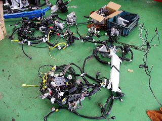 配線 これが、車を動かしている配線です。 大きく分けて3つの配線の束から構成されております。 実は、これが結構重たいです。 |