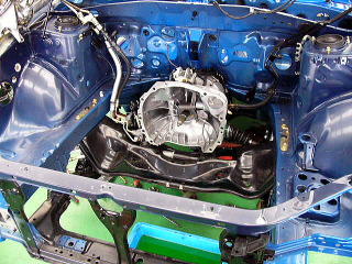 心臓のなくなったエンジンルーム この後ミッションや足回りの分解に移ります。 |