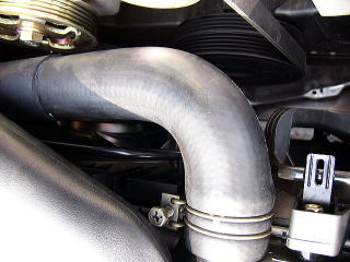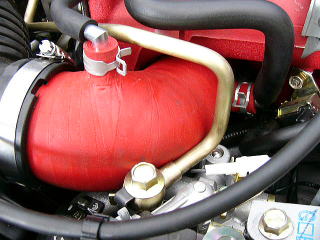 エンジンルーム 対策4 ちょっと驚くかもしれませんが、ラジエーターホースはノーマルです。 規則で社外品への交換が認められておりませんので、ロアホースのみ針金を入れるなどして、潰れる事を防止する対策を施します。 |