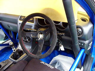 いよいよハンドルが付きました・ シートは移動用の暫定です。 国内車検取得する為、ロールバーパッドが競技時の必要量よりも多く巻かれております。 車検取得時にはノーマルシートにて対応いたします。 |