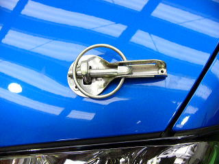ボンネットピン ボンネットの固定には左右にこのピンを装着いたします。 ラリーでは上下の振動も過大になるため、ボディー側は鉄板を当てて溶接補強した上で、装着しております。 |