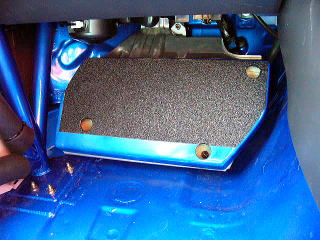 組付け作業 室内 あ! もうインパネがついております。(この更新作業中もどんどん部品が装着されていきます) ロールゲージが特殊な形状のため、付いていないフロントガラス側より入れるという『荒業』を披露する事になります。 足元に見えるのは当社製品の『ヒールプレート(汎用』です。 軽自動車からどんな車にでも対応している優れものです。 |