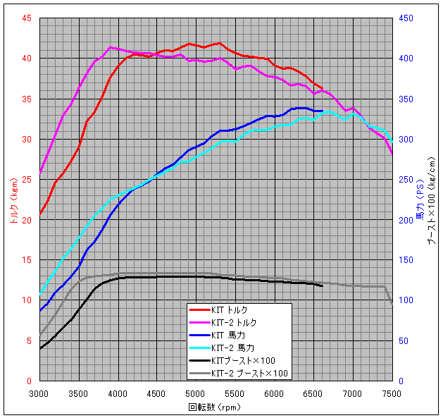 | 回転数 | トルク (kgm) | 馬力 (PS) | ブースト圧 | ブースト圧 | ||