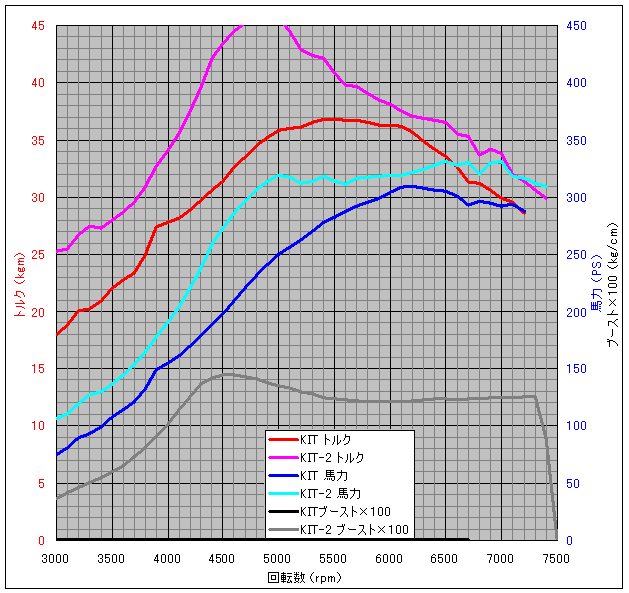 | 回転数 | トルク (kgm) | 馬力 (PS) | ブースト圧 | ブースト圧 | ||